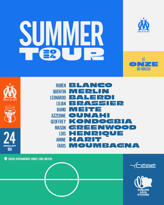 𝙇𝘼 𝘾𝙊𝙈𝙋𝙊 @OMSCT Le onze de départ aligné par coach Roberto De Zerbi 🇮🇹 pour le deuxième match de préparation contre le SC Toulon ⚽️💪
