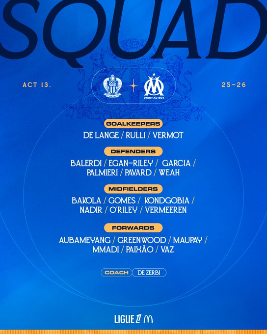 𝐋𝐄 𝐆𝐑𝐎𝐔𝐏𝐄 📋 #OGCNOM 2️⃣1️⃣ Olympiens, choisis par coach 𝗗𝗲 𝗭𝗲𝗿𝗯𝗶 🇮🇹, seront du déplacement du côté de Nice ce soir ! ⚔️
