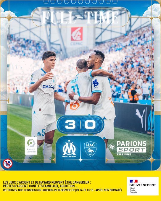 ⏱️ 90+4’ | #OMHAC 3️⃣-0️⃣ L'OM s'impose face au Havre dans un match dominé de la tête et des épaules 💪💙🤍 🗓️ Rendez-vous après la trêve internationale face à Nice, le 21/10.