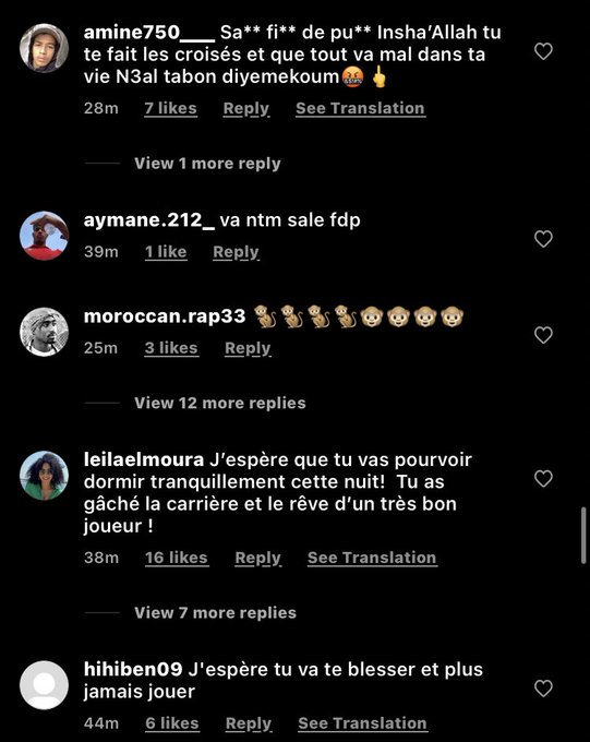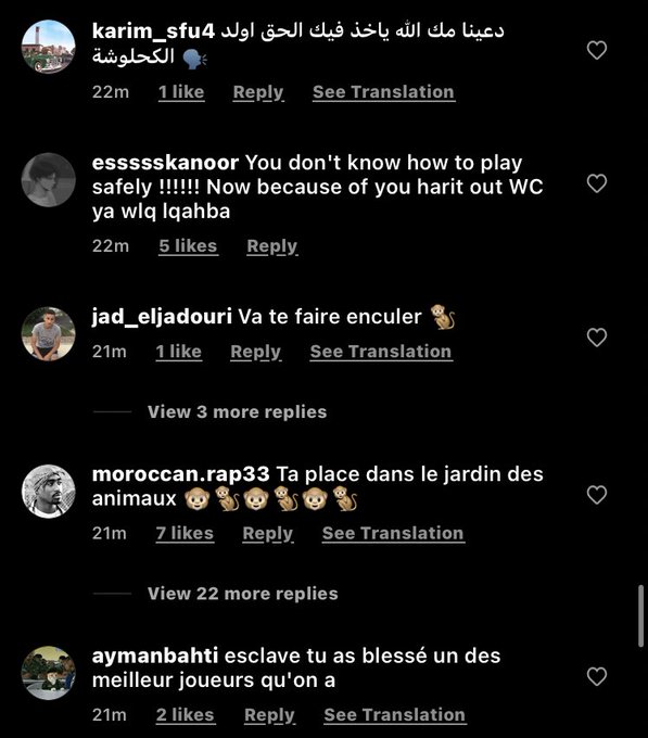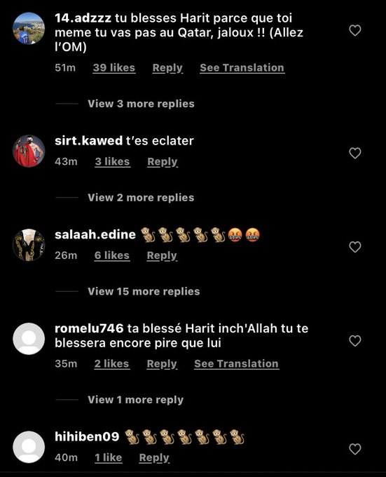 Car évidemment Axel Disasi est considéré comme le « coupable » dans cette blessure d'Amine Harit, le joueur monégasque n'étant pourtant pas auteur d'un geste particulièrement agressif. Mais sur Twitter, le natif de Gonesse a fait l'objet d'insultes racistes de la part de supporters marocains, quelques individus le comparant à « un singe ». Des débordement qui font honte à leurs auteurs, mais qui ne représentent heureusement pas la majorité des commentaires des fans marocains d'abord désolé pour Amine Harit, qui voit son rêve s'envoler au dernier moment. Du côté de l'OM, Dimitri Payet, qui a connu cela avant le Mondial 2018 en se blessant à la cuisse lors de la finale de l'Europa League contre l'Atlético Madrid, sait très bien ce que vit actuellement son coéquipier. Pour Marseille, c'est évidemment aussi un rude coup, l'international marocain n'étant de retour, au mieux, qu'en février 2023.