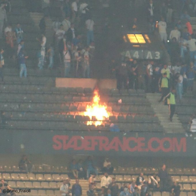 #Football Mécontents de la défaite de leur équipe les supporteurs de #OM mettent le feu aux sièges du #StadeDeFrance