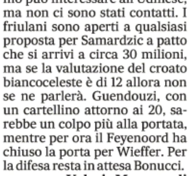 Il Messaggero : Pour #Guendouzi, l’OM continue de réclamer aux alentours de 20M. La Lazio y pense en alternative à Samardzic, mais l’Udinese a fixé un prix à 30M. La piste menant au Marseillais est plus à la portée.