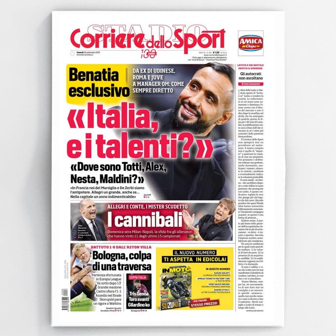 Benatia esclusivo: “Italia, e i talenti?” 👀🤯 I cannibali 🔥 Questa la prima pagina del Corriere dello Sport del 26 settembre