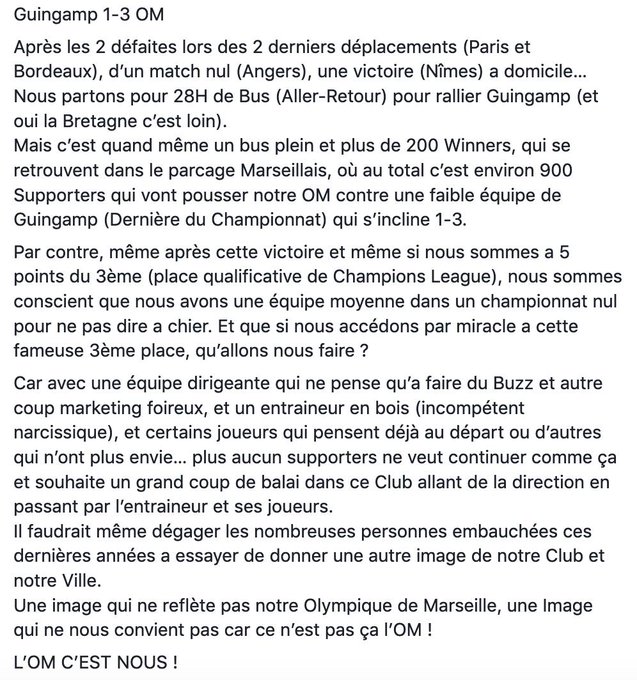 « Même après cette victoire et même si nous sommes à 5 points du 3ème, nous sommes conscients que nous avons une équipe moyenne dans un championnat nul pour ne pas dire à chier. Et que si nous accédons par miracle à cette fameuse 3ème place, qu’allons nous faire ? », s’interroge le groupe de supporters, dans un discours similaire à celui de Florian Thauvin après la défaite à Bordeaux (2-0). D’ailleurs, l’ailier français peut aussi se sentir visé par ce communiqué.