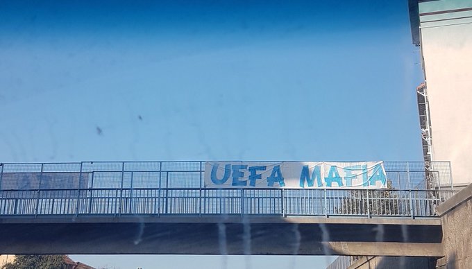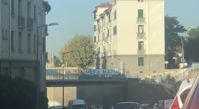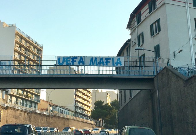 Jour de match ! Sans les supporters olympiens... Message #UEFAmafia déployé dans tout Marseille. #MarseilleFans #TeamOM #OM1899