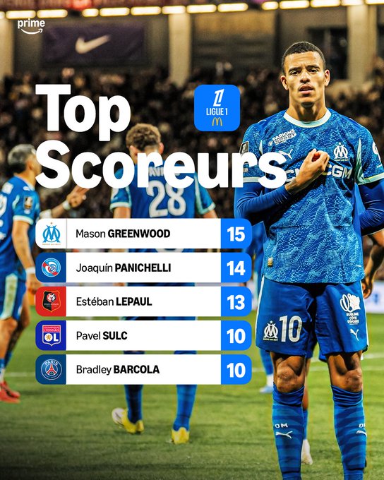 📊 Le classement des buteurs 💥 Mason Greenwood est le seul joueur évoluant dans les cinq grands championnats européens à avoir inscrit au moins 10 buts du pied gauche (10) et du pied droit (15) cette saison, toutes compétitions confondues