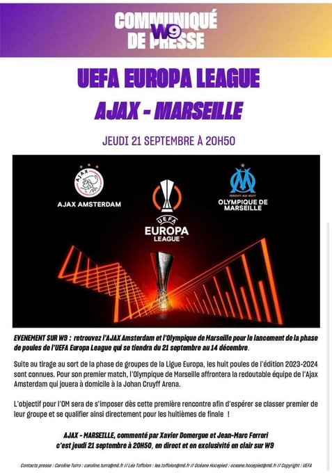 Ajax / OM sur W9 ce jeudi à 21h pour la 1ere journée d'Europa League. Commentaires : @XavierDomergue et JM Ferreri #OM #TeamOM