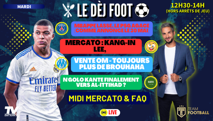 🍽⚽️ Le Dèj Fooooot 🔴 MBappé ne restera pas, confirmation des infos du 30/05 😡 Satin enfonce le #PSG 🔵 #VenteOM Brouhaha terrible, Grine envoie un message 🇸🇦 N'Golo Kanté vers Al-Ittihad ? 💥 Midi Mercato & FAQ 📲 En direct TeamFootball.fr & Twitch.tv/thibaudvezirian