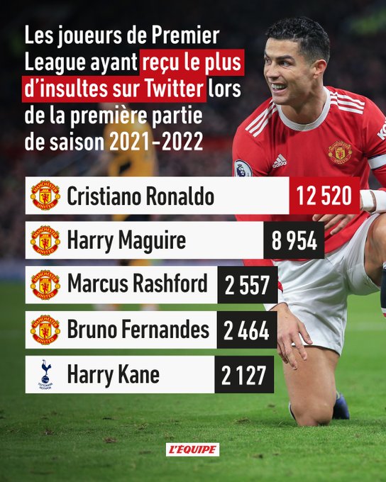 Cristiano Ronaldo et Harry Maguire ont été les joueurs de Premier League ayant reçu le plus d'insultes sur Twitter lors de la première partie de saison 2021-2022. ow.ly/HQEQ50K9OSN