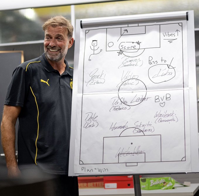 Jurgen Klopp went back to Dortmund on Saturday to manage the Piszczek and Kuba Testimonial match. Someone snapped a pic of his tactics whiteboard: Vibes ⤴️, Score, Plan = Win. These will be my tactics for FC25. 📝