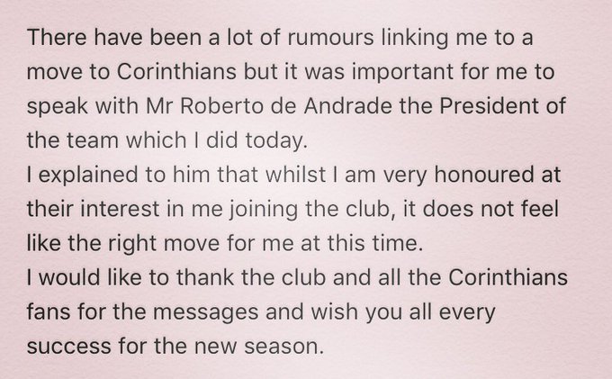 Mais les discussions avec le président Roberto de Andrade n’ont rien donné, comme l’a révélé l’attaquant de 38 ans sur les réseaux sociaux. « Je lui ai expliqué que, même si je suis très honoré de leur intérêt, je ne sens pas que c’est le bon moment pour ce transfert », a publié l’Ivoirien, à qui le club brésilien s’est adressé dans un communiqué.