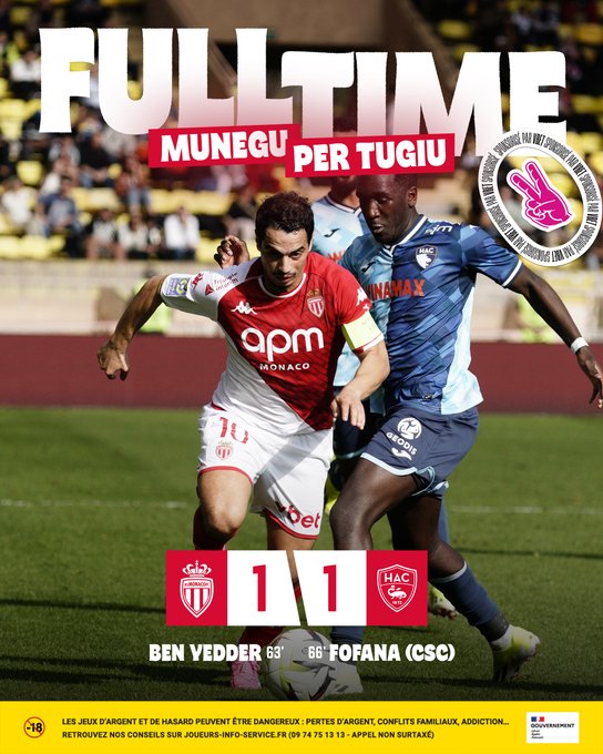 𝗙𝗶𝗻 𝗱𝘂 𝗺𝗮𝘁𝗰𝗵 🔚 L'AS Monaco concède le match nul face au Havre, malgré le 9e but en six matches de Wissam Ben Yedder. Rendez-vous jeudi prochain avec la Coupe de France 🏆 1⃣-1⃣ #ASMHAC