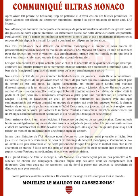 « (...) Comment les joueurs peuvent-ils se permettre, chaque semaine, de s’alcooliser à outrance dans les bars de la Principauté jusqu’à 5 h du matin alors qu’ils ont entraînement à 10 h 30 ? (...) Certains se plaignent de ne pas avoir assez de temps de jeu alors que nous savons qu’ils passent plus de temps au bar que nous », a-t-on appris dans ce texte intitulé « Mouillez le maillot ou cassez-vous ! ». On pouvait évidemment douter de ces accusations. Du moins jusqu’à la décision prise par Philippe Clement.