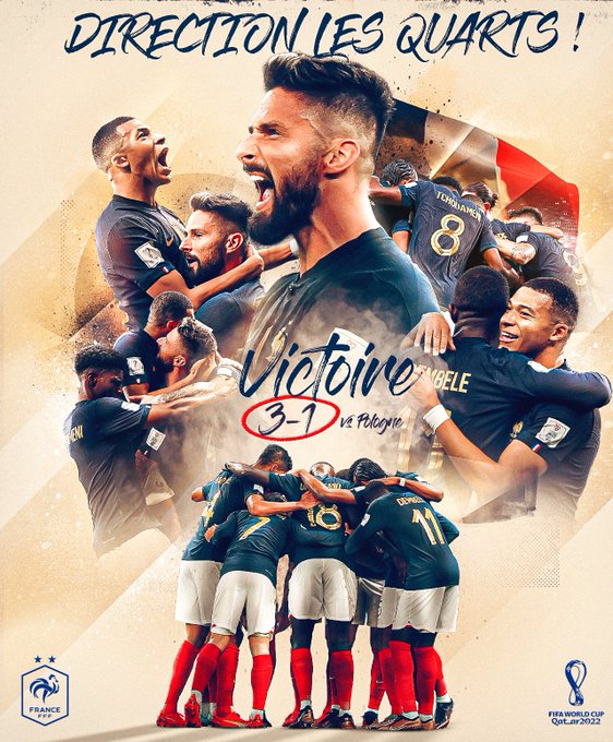 𝘿𝙄𝙍𝙀𝘾𝙏𝙄𝙊𝙉 𝙇𝙀𝙎 𝙌𝙐𝘼𝙍𝙏𝙎 ! 🇫🇷🤩 Les Bleus s’imposent (3-1) face à la Pologne 💪 @_OlivierGiroud_ devient le meilleur buteur de l’histoire et @KMbappe signe ses 4e et 5e buts de la 𝘾𝙤𝙪𝙥𝙚 𝙙𝙪 𝙈𝙤𝙣𝙙𝙚 🔥 🇫🇷3-1🇵🇱 #FRAPOL | #FiersdetreBleus