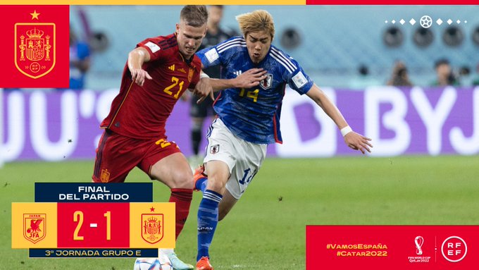 🏁 ¡¡FINAL DEL PARTIDO EN DOHA!! La @SEFutbol lo ha intentado hasta el final, pero cae por la mínima ante Japón. Con este resultado y la victoria de #GER 🆚 #CRC, España pasa a octavos de final como segunda del Grupo E. #JPN 🆚 #ESP | 2-1 | 90+5’ #VamosEspaña | #Catar2022