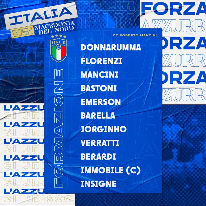 Play Off 🌍 #Mondiale Gli 11 #Azzurri 💙 scelti dal Ct Mancini per 🇮🇹 #Italia 🆚 #MacedoniaDelNord 🇲🇰 ⏱️ Oggi, ore 20.45 🏟️ Stadio “Renzo Barbera” - #Palermo 📺 In diretta su #Rai1 #Qatar2022 #ITAMKD #Azzurri #Nazionale #VivoAzzurro