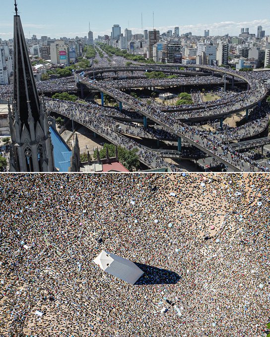 ⚽️🇦🇷 Impossible d’avancer en bus à impériale. Trop de monde. Les joueurs pourraient saluer la foule à bord d’hélicoptères. Certains supporters les saluent déjà au cas où ! Unique Argentine.