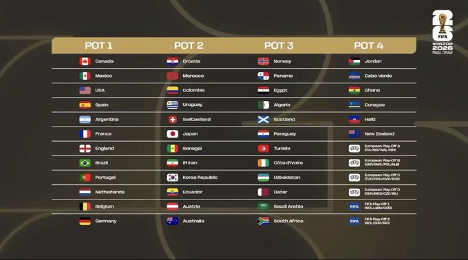 Coupe du monde 2026. La plus prestigieuse des compétitions internationales aura lieu sur trois territoires américains, aux Etats-Unis, au Mexique et au Canada. Le match d'ouverture doit avoir lieu le 11 juin, tandis que la finale du 18 juillet clôturera le tournoi. Pour l'occasion, le Mondial ne comptera pas 32 équipes, comme lors des éditions précédentes, mais bien 48. Pour l'heure, 42 nations ont déjà obtenu leur prestigieux billet, tandis que six autres sélections doivent se qualifier via les barrages en mars prochain afin de faire partie du voyage. En attendant, la FIFA a pris les devants en dévoilant officiellement les quatre chapeaux qui serviront pour le tirage au sort des groupes le 5 décembre prochain à Washington DC.