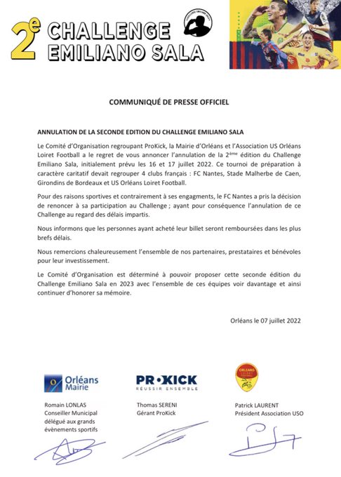 Cette semaine, le FC Nantes a officialisé sa décision de ne pas participer au tournoi organisé à Orléans en mémoire d’Emiliano Sala et qui réunit chaque année le club local, Bordeaux, Caen et Nantes, la recette étant reversée à des associations caritatives. Les dirigeants des Canaris ont en effet considéré que compte tenu de la situation des Girondins, ils n’étaient pas certains d’avoir un adversaire à la hauteur dans le cadre de sa préparation estivale. Ce tournoi devant avoir lieu les 16 et 17 juillet prochains, les organisateurs n’ont pas eu réellement d’autre choix que d’annuler cette série de matchs amicaux. « Le Comité d'Organisation a le regret de vous annoncer l'annulation de la 2e édition du Challenge Emiliano Sala, initialement prévu les 16 et 17 Juillet 2022. Ce tournoi de préparation à caractère caritatif devait regrouper 4 clubs français : FC Nantes, Stade Malherbe de Caen, Girondins de Bordeaux et US Orléans Loiret Football. Pour des raisons sportives et contrairement à ses engagements, le FC Nantes a pris la décision de renoncer à sa participation au Challenge ayant pour conséquence l'annulation de ce Challenge au regard des délais impartis (...) Le Comité d'Organisation est déterminé à pouvoir proposer cette seconde édition du Challenge Emiliano Sala en 2023 avec l'ensemble de ces équipes voir davantage et ainsi continuer d'honorer sa mémoire », précisent les organisateurs, qui vont rembourser les 1500 spectateurs qui avaient déjà acheté un billet pour ce tournoi. Si les dirigeants du FC Nantes voulaient se mettre du monde à dos, c'est réussi.
