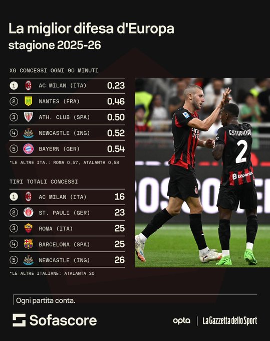 🔴⚫️ Milan est l’équipe ayant le plus faible taux de xG concédés et ayant subie le moins de frappe en Europe. (@acmilandata)