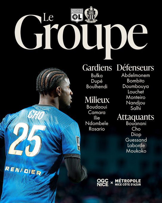 Le groupe pour la rencontre de demain face à Lyon #OLOGCN 🔴⚫️
