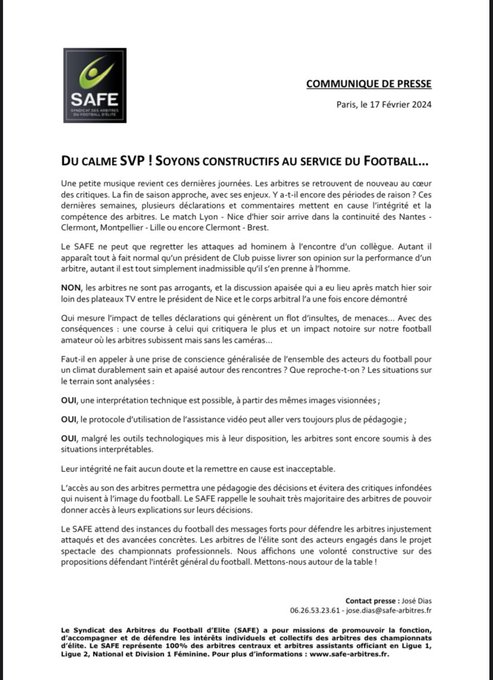« Une petite musique revient ces dernières journées. Les arbitres se retrouvent de nouveau au cœur des critiques. La fin de saison approche, avec ses enjeux. Y a-t-il encore des périodes de raison ? Ces dernières semaines, plusieurs déclarations et commentaires mettent en cause l’intégrité et la compétence des arbitres. Le match Lyon-Nice arrive dans la continuité des Nantes-Clermont, Montpellier-Lille ou encore Clermont-Brest. Le SAFE ne peut que regretter les attaques ad hominem à l’encontre d’un collègue. Autant il apparaît tout à fait normal qu’un président de club puisse livrer son opinion sur la performance d’un arbitre, autant il est tout simplement inadmissible qu’il s’en prenne à l’homme. Non, les arbitres ne sont pas arrogants, et la discussion apaisée qui a eu lieu après match hier soir loin des plateaux TV entre le président de Nice et le corps arbitral l’a une fois encore démontré », a écrit le SAFE tout en appelant les instances à ne plus laisser passer ce genre d'attaques.