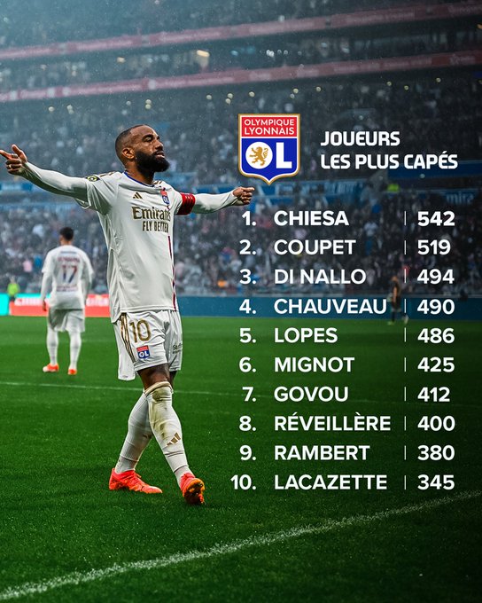 🔝1️⃣0️⃣ 🔴🔵 Décisif lors de #OLASM, @LacazetteAlex est désormais à la 10e place des joueurs les plus capés avec l'OL 🚀 Il devance @Juninhope08 (344 matchs) 🤩