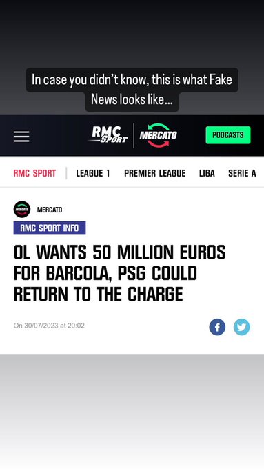 Et si finalement, le nouveau président de l’Olympique Lyonnais disait vrai ? Sur son compte Instagram officiel, John Textor a fermement démenti l’information de RMC selon laquelle Lyon est susceptible d’ouvrir la porte à Bradley Barcola, en cas d’offre à hauteur de 50 millions d’euros de la part du Paris Saint-Germain. « Au cas où vous ne le sauriez pas, voici à quoi ressemblent les fake news » a écrit le propriétaire de l’OL avec une capture d’écran de l’information de RMC sur le prix fixé par Textor pour le transfert de Bradley Barcola. L’international espoirs français semble définitivement intransférable et pour le PSG, la tentation de lâcher le dossier sera de plus en plus grande dans les semaines à venir avec la signature potentielle d’Ousmane Dembélé à ce poste d’ailier droit.