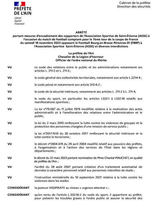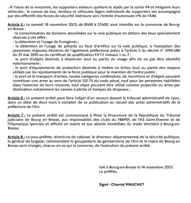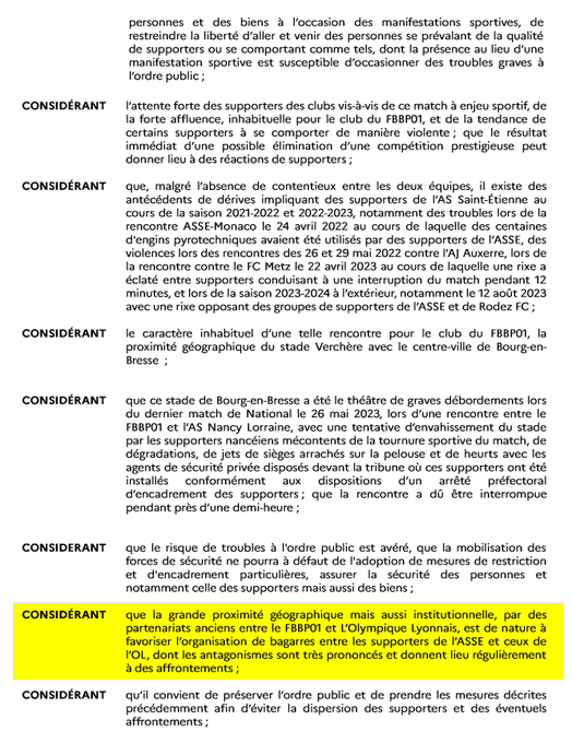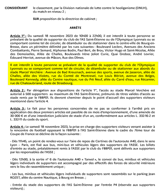 Si le match de coupe de France Bourg - St Etienne est limité à 500 supporters stéphanois, il est en revanche interdit à TOUT supporters lyonnais, en raison de "la grande proximité géographique mais aussi institutionnelle entre le FBBP01 et L’OL"