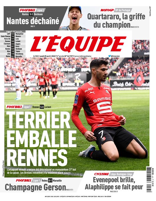 21e but de la saison pour Martin Terrier en Ligue 1 hier. ❤️🖤 « Terrier emballe Rennes » à la Une de @lequipe de ce lundi 25 avril.