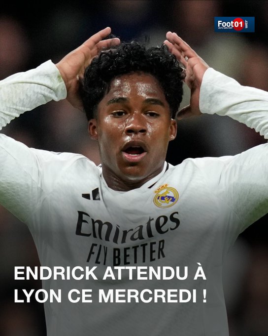 Endrick, l'avant-centre brésilien du Real Madrid, doit rejoindre l'OL ce mercredi en vue du mercato d'hiver. ➡️ l.foot01.com/RW