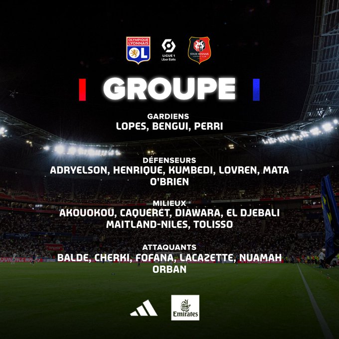 🦁 Voici notre 𝗴𝗿𝗼𝘂𝗽𝗲 pour la réception de Rennes ce soir à 21h au @GroupamaStadium 🔴🔵 #OLSRFC