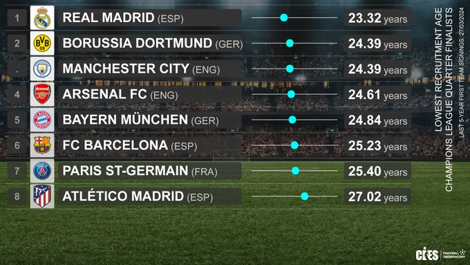 Average age at recruitment of last 5⃣ season first-team signings, #ChampionsLeague quarter-finalists 🥇 #RealMadrid 🇪🇸 23.32 🥈 #BVB 🇩🇪 & #ManCity 24.39 #Arsenal 24.61 #FCBayern 24.84 #FCBarcelona 25.23 #PSG 25.40 #Atleti 27.02 Data for 7⃣7⃣7⃣ teams🌏 👉 football-observatory.com/WeeklyPost457
