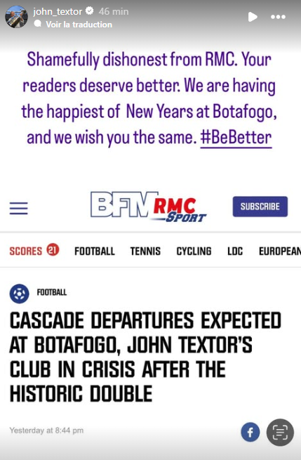John Textor souhaite une bonne année à @RMCsport (Instagram du propriétaire l'OL)