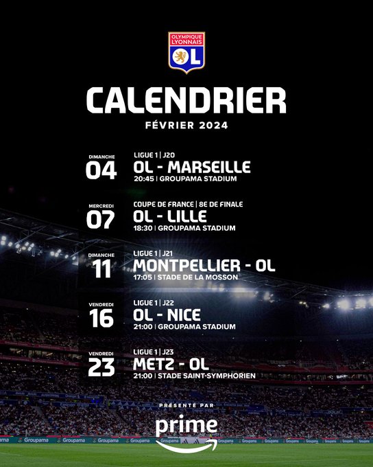 📆 Notre calendrier provisoire pour le mois de février 🦁 3⃣ rencontres à la maison 🏠 & 2⃣ déplacements 🚌 au programme pour nos Gones 🔴🔵 🎟 Vos places pour nous soutenir au stade ➡ billetterie.ol.fr/fr/ 📱 Ou suivez nos matchs sur @PVSportFR 👉 primevideo.com/offers/?benefi…
