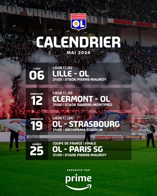 📆 Notre calendrier pour le mois de mai 🦁 2⃣ déplacements en @Ligue1UberEats 🚌, la dernière journée à la maison 🏠, puis la finale de la Coupe de France 🏆 au programme 🔴🔵 🎟 ➡ billetterie.ol.fr/fr/ 📱 Ou suivez nos matchs sur @PVSportFR 👉 primevideo.com/offers/?benefi…