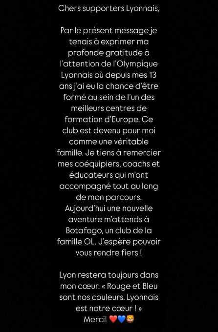 « Je tenais à exprimer ma profonde gratitude à l’attention de l’Olympique Lyonnais où depuis mes 13 ans, j’ai eu la chance d’être formé au sein de l’un des meilleurs centres de formation d’Europe. Ce club est devenu pour moi comme une véritable famille. Je tiens à remercier mes coéquipiers, coachs et éducateurs qui m’ont accompagné tout au long de mon parcours. Aujourd’hui, une nouvelle aventure m’attend à Botafogo, un club de la famille OL. J’espère pouvoir vous rendre fiers ! Lyon restera toujours dans mon coeur. “Rouge et Bleu sont nos couleurs, Lyonnais est notre coeur !”. Merci », a expliqué, dans un message publié sur ses réseaux sociaux, El Arouch, qui espère revenir un jour à l’OL par la grande porte, comme Georges Mikautadze a par exemple pu le faire cet été.
