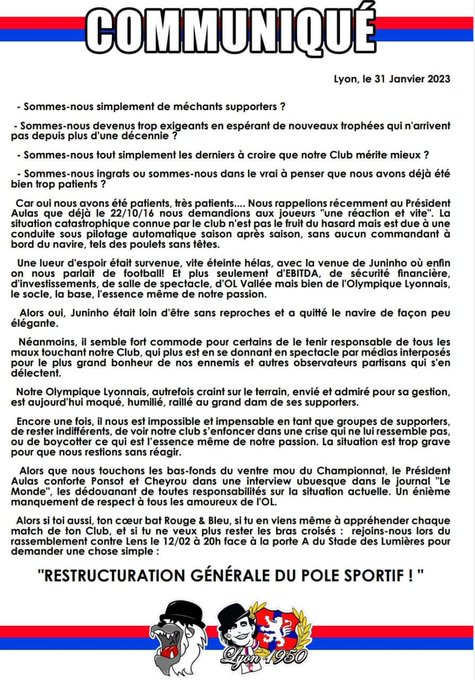 [#DirectionOL] Les groupes de supporters ont décidé que l'@OL, Jean-Michel #Aulas en tête, s'étaient assez foutus de leur g... Et eux, ils ne sont pas belges. #TeamOL #clubdepouletssanstête