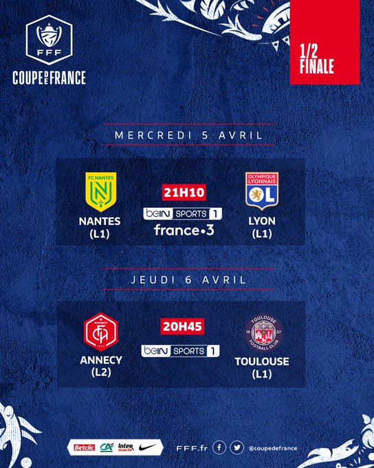 La 𝙥𝙧𝙤𝙜𝙧𝙖𝙢𝙢𝙖𝙩𝙞𝙤𝙣 officielle des 1/2 finales de la #CoupeDeFrance 🏆📺 🗓️ Mercredi 5 avril - 21h10 ⚡️@FCNantes 🆚 @OL 📺 @France3tv / @beinsports_FR 🗓️ Jeudi 6 avril - 20h45 ⚡️@FCAnnecy 🆚 @ToulouseFC 📺 @beinsports_FR