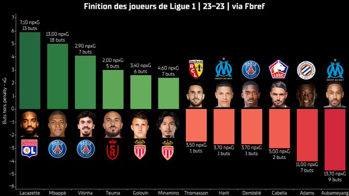 ⚽️ Les tueurs devant les cages ! Ci-dessous les 6 joueurs de L1 qui sur-performent et sous-performent le plus leurs npxG (xG sans penalty) 👇 🦁 Le Général Lacazette tellement clutch face aux cages ! On parle souvent du mercato lyonnais mais le retour en forme de l'OL est