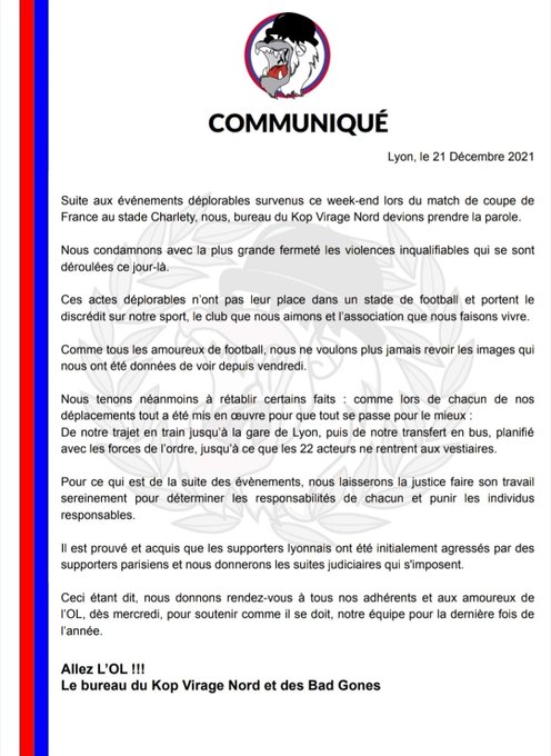 Toutefois, ces supporters ne veulent pas être les boucs-émissaires et les seuls fautifs des incidents. Ils indiquent que les premiers faits de violence seraient du ressort de supporters Parisiens. « Nous tenons néanmoins à rétablir certains faits : comme lors de chacun de nos déplacements tout a été mis en œuvre pour que tout se passe pour le mieux. De notre trajet en train jusqu’à la gare de Lyon, puis de notre transfert en bus, planifié avec les forces de l’ordre, jusqu’à ce que les 22 acteurs ne rentrent aux vestiaires. Il est prouvé et acquis que les supporters lyonnais ont été initialement agressés par des supporters parisiens et nous donnerons les suites judiciaires qui s’imposent […] nous laisserons la justice faire son travail sereinement », indiquent-ils. Décidément, cette affaire paraît bien complexe et la FFF aura beaucoup de travail pour mêler le vrai du faux et établir les responsabilités de chacun, le 28 décembre prochain.