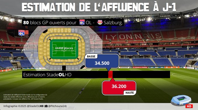 #OLRBS J-1 Estimation de l'affluence totale basée sur la configuration du stade, les ventes effectives et les affluences de 13 matchs similaires. Compte non affilié à l'OL.