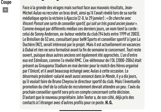Nous travaillons ensemble avec John et il n’y a pas de volonté d’aller chercher un DS.Ce n'est pas très amusant pour la presse qui a besoind'inventer des "présidents-salariés" pour nourrir un drama imaginaire je n’ai jamais été salarié de l’OL je suis Président DG depuis 1987 !