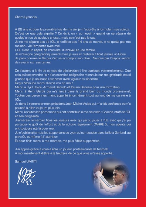 Transféré cette semaine de l’Olympique Lyonnais, son club de cœur, au FC Barcelone, Samuel Umtiti a accompli le rêve de sa vie de footballeur. S’il a déjà remercié plusieurs fois ses dirigeants et ses entraineurs pour son parcours réussi entre Rhône et Saône, le défenseur central a pris la parole sur les réseaux sociaux pour publier une lettre d’adieu à son image, humble, posée et pleine de reconnaissance pour l’Olympique Lyonnais, avec une première dédicace à Régis Molouba, l’entraineur des Benjamins à Ménival, et qui l’a poussé vers l’Olympique Lyonnais.