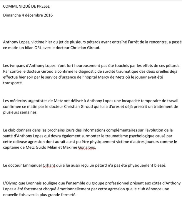« Les médecins urgentistes de Metz ont délivré à Anthony Lopes une incapacité temporaire de travail confirmée ce matin par le docteur Christian Giroud qui lui a d'ores et déjà prescrit un traitement de plusieurs semaines.