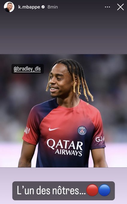 Killian Mbappé affiche son soutien à Bradley Barcola insulté durant la rencontre opposant Lyon au PSG. « L’un des nôtres 🔴🔵 » #OLPSG