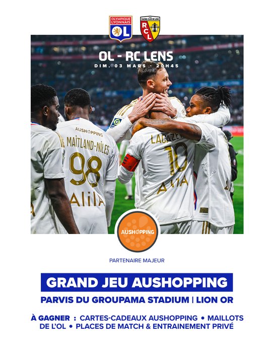 🚨 Avant #OLRCL, notre partenaire Aushopping vous proposera un grand jeu avec de nombreux lots à gagner 🎁 📍 Rdv Lion OR 🦁 ⏲️ À partir de 18h15