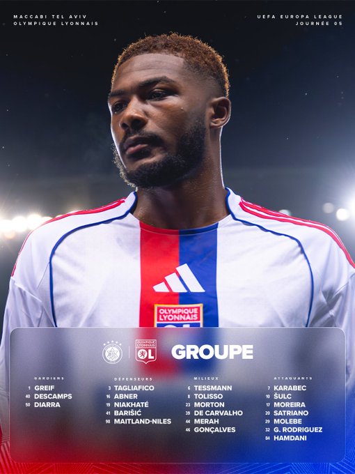🦁 Notre groupe convoqué pour notre match face au Maccabi Tel Aviv, en Serbie, ce soir à 21h 🔴🔵 #MTAOL