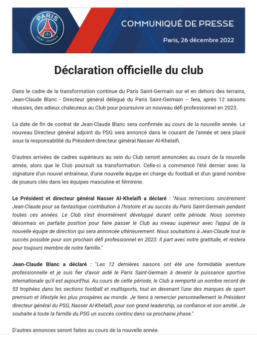 « Dans le cadre de la transformation continue du Paris Saint-Germain sur et en dehors des terrains, Jean-Claude Blanc - Directeur général délégué du Paris Saint-Germain – fera, après 12 saisons réussies, des adieux chaleureux au Club pour poursuivre un nouveau défi professionnel en 2023. La date de fin de contrat de Jean-Claude Blanc sera confirmée au cours de la nouvelle année. Le nouveau Directeur général adjoint du PSG sera annoncé dans le courant de l'année et sera placé sous la responsabilité du Président-directeur général Nasser Al-Khelaifi. D'autres arrivées de cadres supérieurs au sein du Club seront annoncées au cours de la nouvelle année, alors que le Club poursuit sa transformation. Celle-ci a commencé l'été dernier avec la signature d'un nouvel entraîneur, d'une nouvelle équipe en charge du football et d'un grand nombre de joueurs clés dans les équipes masculine et féminine », précise le PSG. Pour le remplacer, rien n'a encore été décidé du côté de Paris, mais une intervention pourrait rapidement intervenir et le nom de Grégory Durand, directeur des affaires juridiques sportives du PSG, est cité dans le quotidien sportif pour éventuellement prendre la place de Jean-Claude Blanc.