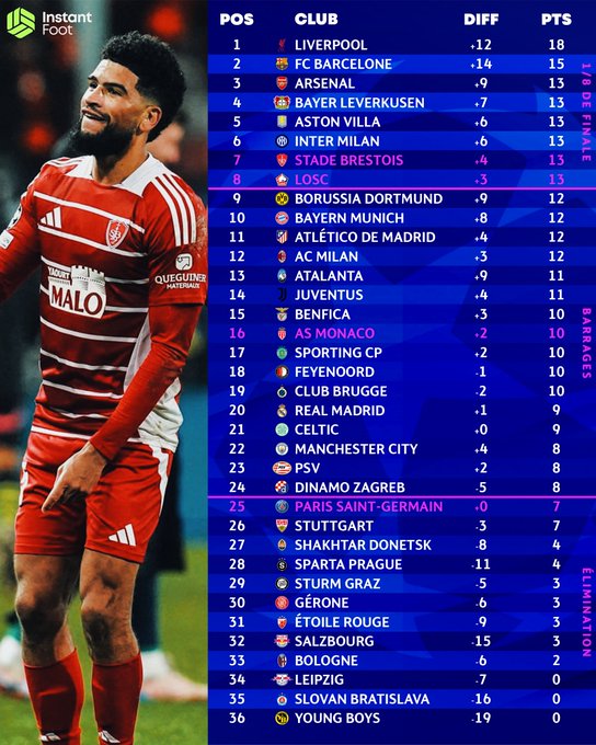 🚨 𝗟𝗘 𝗖𝗟𝗔𝗦𝗦𝗘𝗠𝗘𝗡𝗧 𝗘𝗡 𝗟𝗜𝗚𝗨𝗘 𝗗𝗘𝗦 𝗖𝗛𝗔𝗠𝗣𝗜𝗢𝗡𝗦 𝗔𝗣𝗥𝗘̀𝗦 𝗟𝗔 𝟲𝗘̀𝗠𝗘 𝗝𝗢𝗨𝗥𝗡𝗘́𝗘 ! 📊 🇫🇷 Brest et le LOSC continuent de régaler et sont assurés de revoir la Ligue des Champions après la phase de ligue, au moins pour les barrages ! 🔥 L'AS Monaco